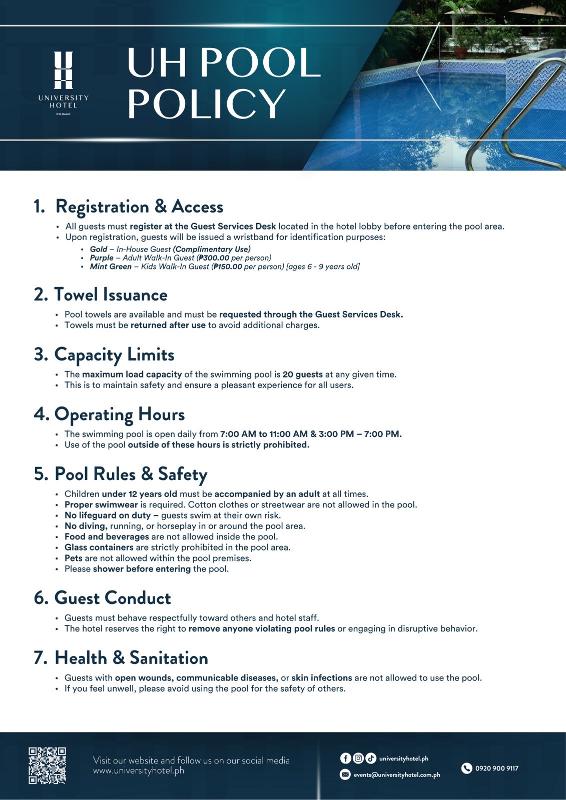 To ensure the safety and comfort of all swimmers, only a maximum of twenty (20) guests per batch in the morning and afternoon shall be accommodated.