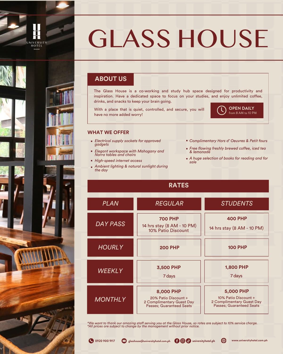Advanced Reservations are required to secure your spot. Email glasshouse@universityhotel.com.ph to book your seat. Walk-ins are welcome but seats are subject to availability at the time of arrival.